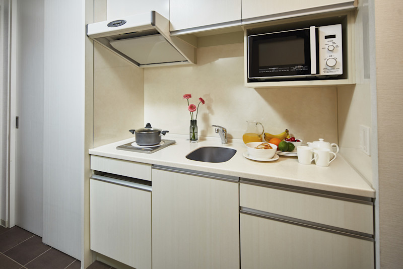 お部屋にはキッチン(カトラリー付)を完備。近隣のスーパーや京都の台所錦市場商店街、百貨店で購入したおばんざいや食材を持ち寄ってゆっくりとお部屋でお召し上がりください。