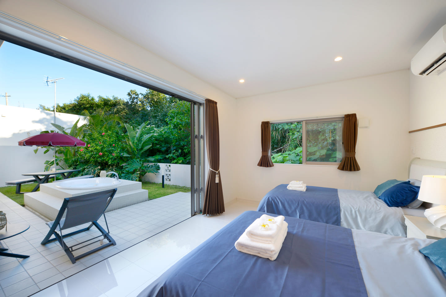 仕事終わりには庭の露天ジャグジーに浸かりながら、島の風と夕暮れをゆっくり楽しめます。