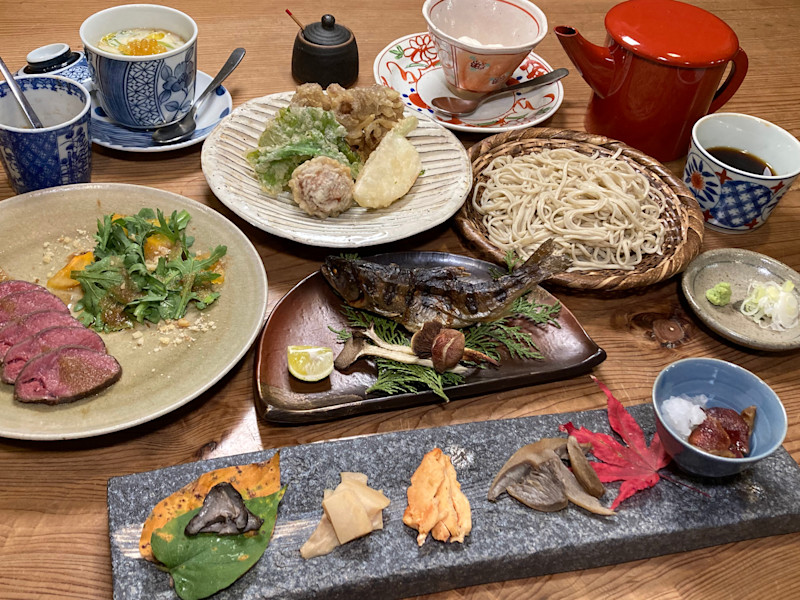 B. 二食つき(山の幸と手打ちそばのコース料理)※食事処「おすくに」にて