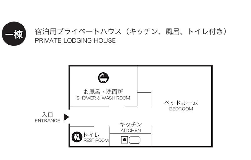 専用キッチン、お風呂、トイレがついたワンルーム一棟貸しのタイニーハウスです。