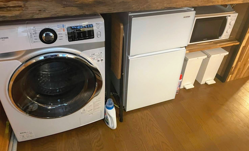 食器、調理器具付きの広々キッチン、洗濯機にリネン類やアメニティも完備。