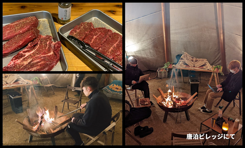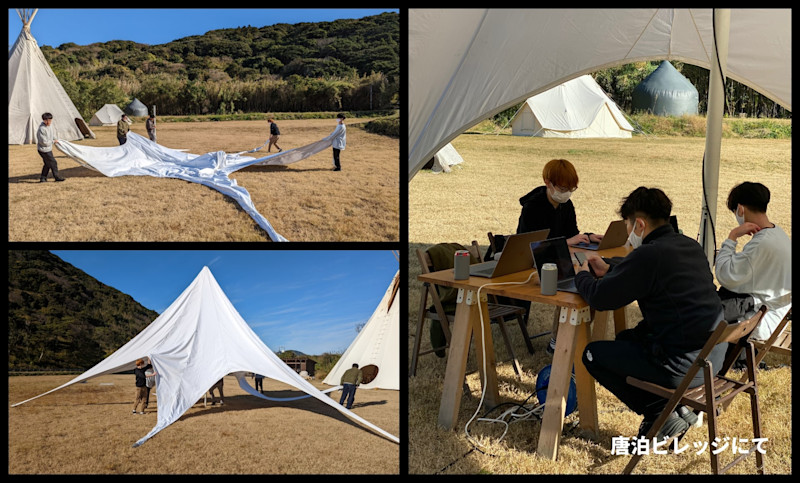 ワーケーションの醍醐味である、チームビルディングの一環として、唐泊ビレッジのスタッフの方のサポートの元、みんなでテントをたて、その中で作業をしました。屋外で仕事をする時間は「ザ・ワーケーション」という感じで気分良く仕事ができました。
