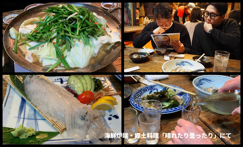夕食はホテルから歩いていける距離にある天神の「晴れたり曇ったり」に行ってみました。「呼子のイカ」「ゴマ鯖」「もつ鍋」などの福岡でしか味わえないご当地料理をひたすら食べました!美味しい料理に美味しいお酒の堪能しとても満足でき、偶然の出会いで、隣の席にいらっしゃった福岡で事業をおこなっている方々に混ぜていただき楽しいひと時をすごしました。
