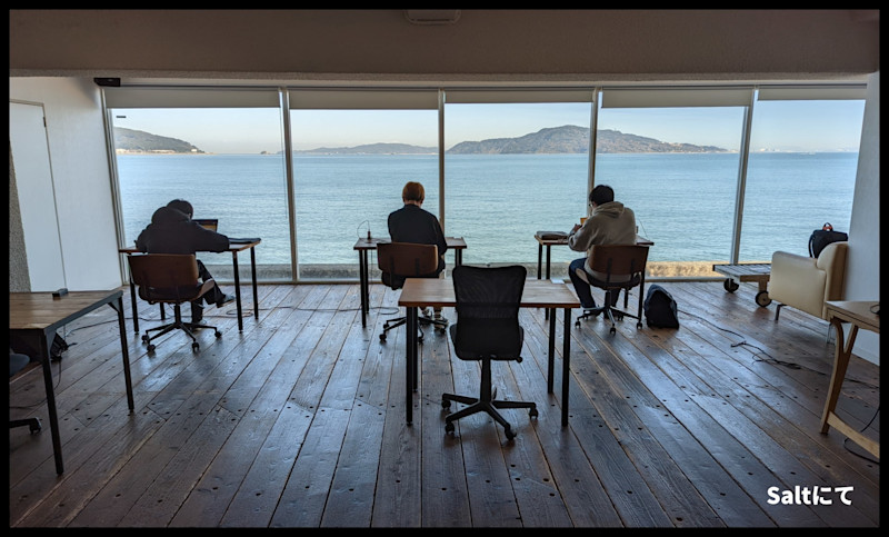 3日目は海岸沿いにあるおしゃれなコワーキングスペース「SALT」で作業をしました。1階から5階まである施設は、様々な職種の方が仕事を行なっていました。