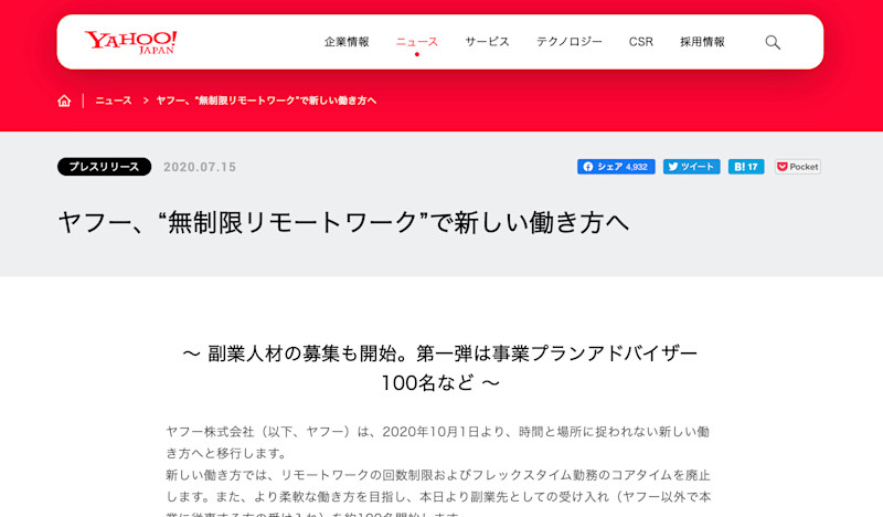 大手IT企業のヤフーも無期限リモートワークを発表していますね。