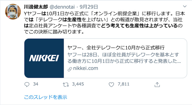 ヤフーの代表の川邊さんもリモートワークについてポジティブなツイートをしています👀