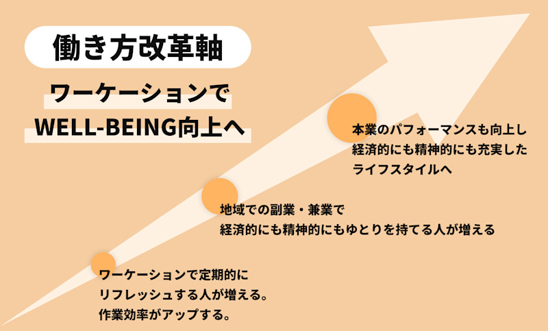 利用者目線では、ワーケーションの滞在先で非日常を味わったり、アクティビティを体験する中でリフレッシュできたり、ワーケーションは仕事の効率が向上するということも証明され始めています。また、ワーケーションで地域の副業などに参加することで、結果的に本業でのパフォーマンスも向上するのではと考えています。