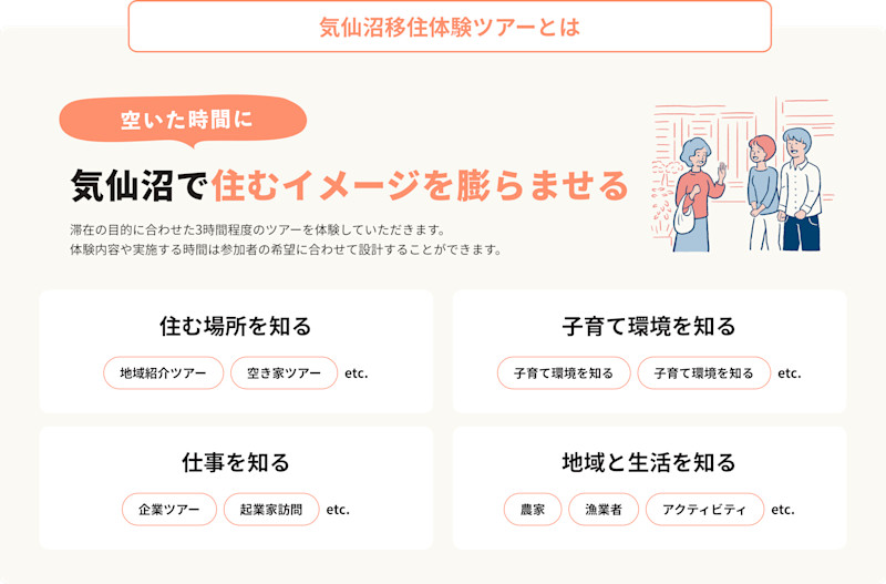 気仙沼市は、移住を検討している方にもっとゆっくりじっくり気仙沼を味わっていただきたいという思いから、3泊4日以上滞在される方に1日6,500円、最大13泊分の補助金を出しました。気仙沼の疑似体験が目的で、参加者には「気仙沼移住体験ツアー」という滞在の目的に合わせた3時間程度のツアーを体験していただくことが必須となっています。(※募集終了)