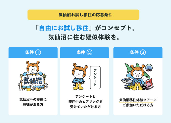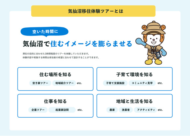 ※「気仙沼移住体験ツアー」:移住のイメージを膨らませていただくために「住む場所」「子育て環境」「仕事」などを体験できるコンテンツを準備しております。