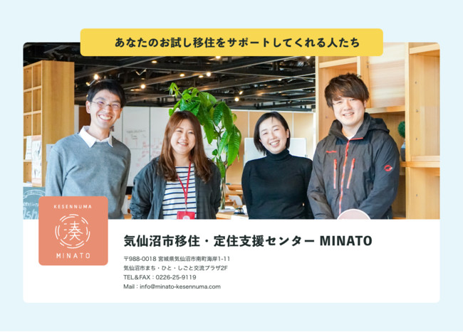 気仙沼市移住・定住支援センター MINATOは気仙沼への移住を検討される方はもちろん、2拠点居住、テレワーク、関係人口など、地域と関わりたいという人たちのための総合相談窓口を運営しており、今回の取り組みでは、お試し移住参加者を全面的にサポートしていただける団体様です。