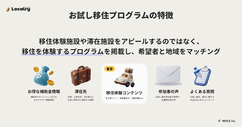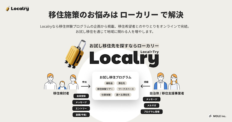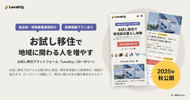 株式会社MOLE<本社:東京都、代表取締役:岡崎(古田)友宏>は、地域への関係人口・移住促進を支援する新サービス「Localry(ローカリー)」を2025年秋に正式公開いたします。Localryは、全国の「お試し移住プログラム」を掲載・マッチングできるプラットフォームで、自治体・地域事業者が抱える移住支援施策の課題を、デジタルの力で解決します。