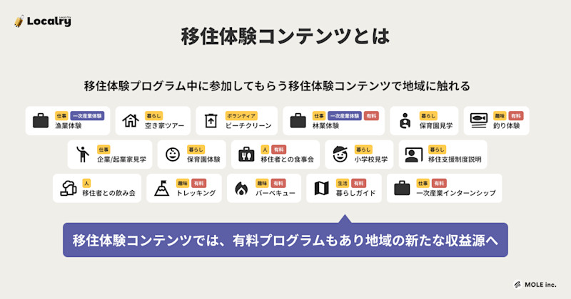 Localryの移住体験コンテンツは、住む場所、子育て環境をめぐるツアーや、地域の企業やコミュニティとの接点を持つコンテンツを想定していて、中には有料コンテンツもあるので地域の新たな収益源になることを目指しています。